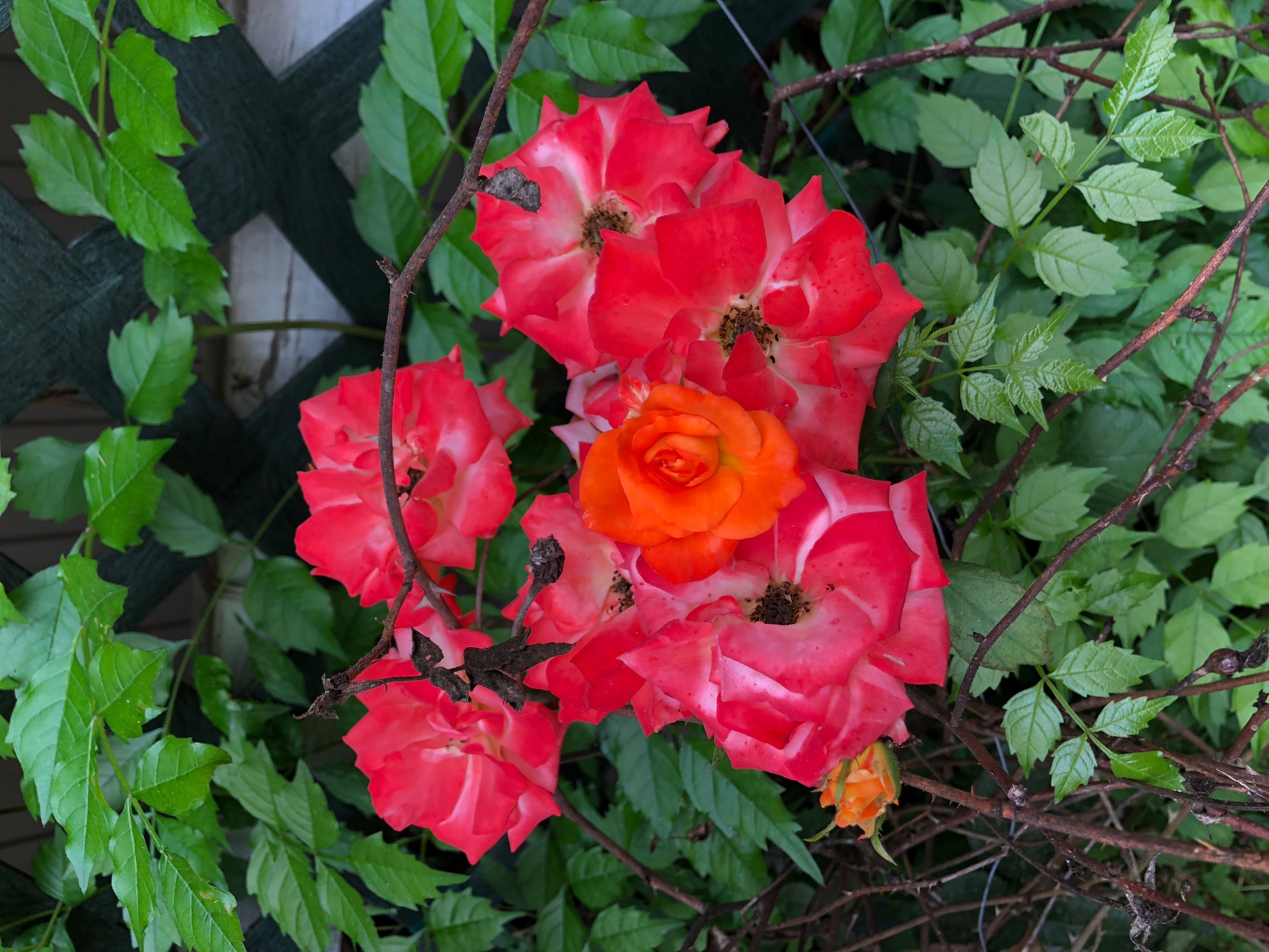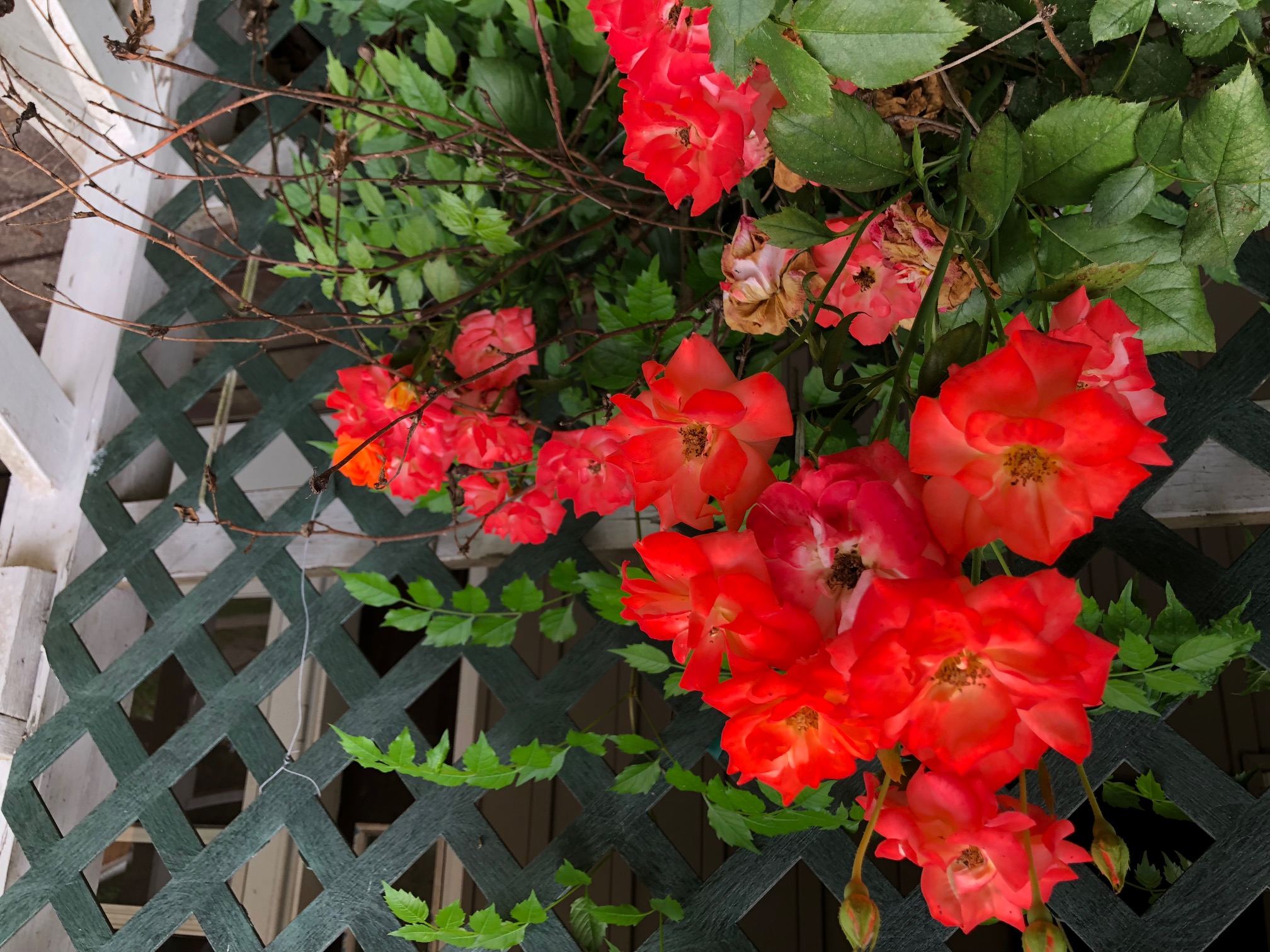 Mom and Dad loved roses. For many, many years dad tried to graft two roses, one red and one yellow, to create an orange rose. He never saw an orange rose. After they passed away in 2000 and I inherited house, I found out why, dad never saw an orange rose. Every year, while they were alive, mom and dad would cut the rose bushes back, to get rid of dead branches and to just keep the bush small. It turned out, that they were cutting the bushes back, too far. This is what I saw after the second year (I didn't cut them back), and every year since.